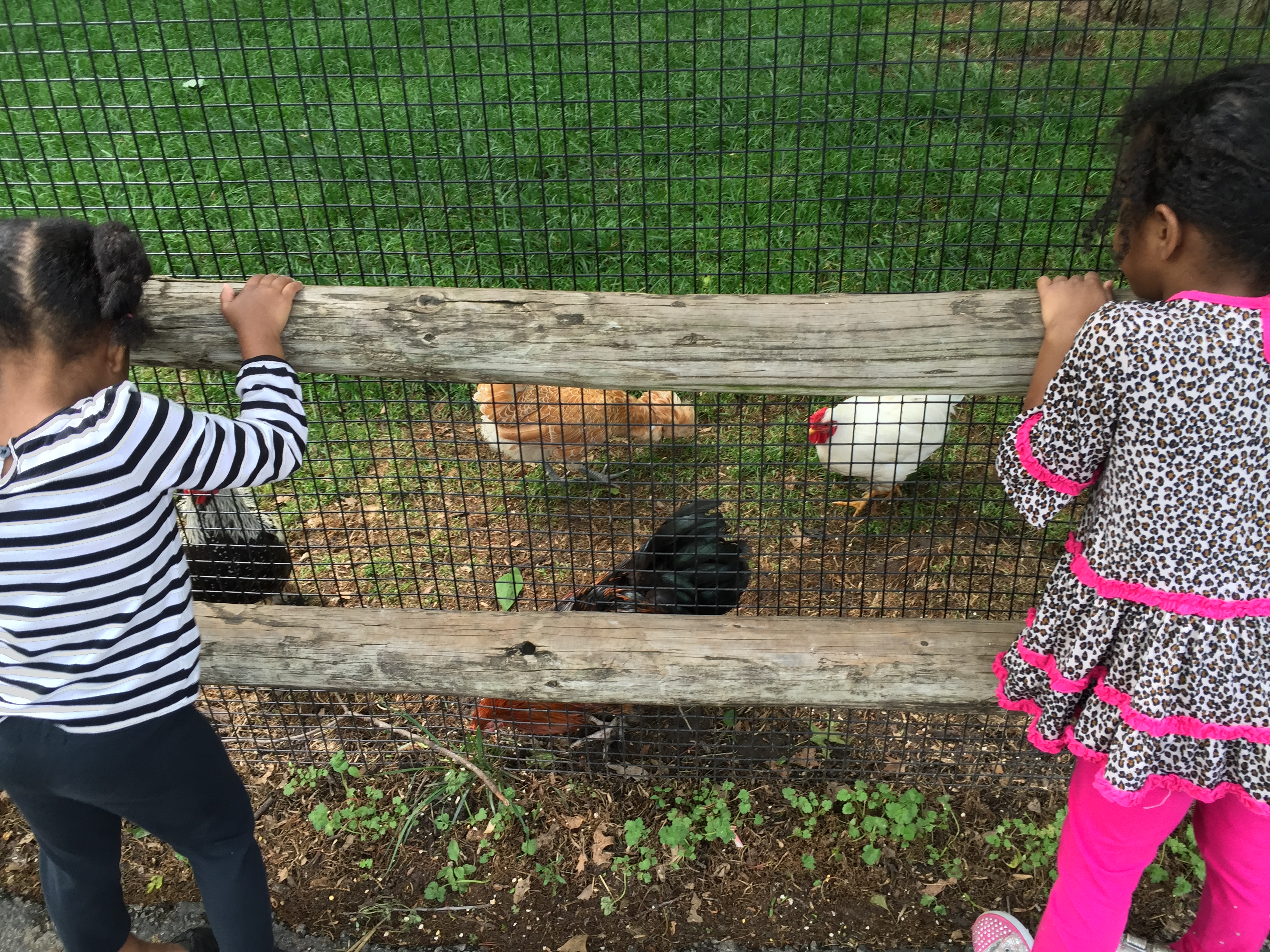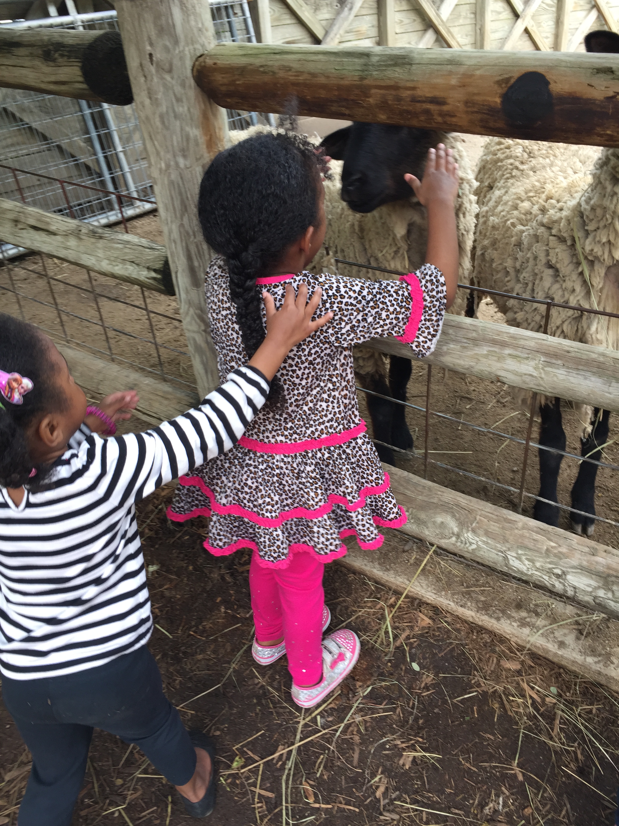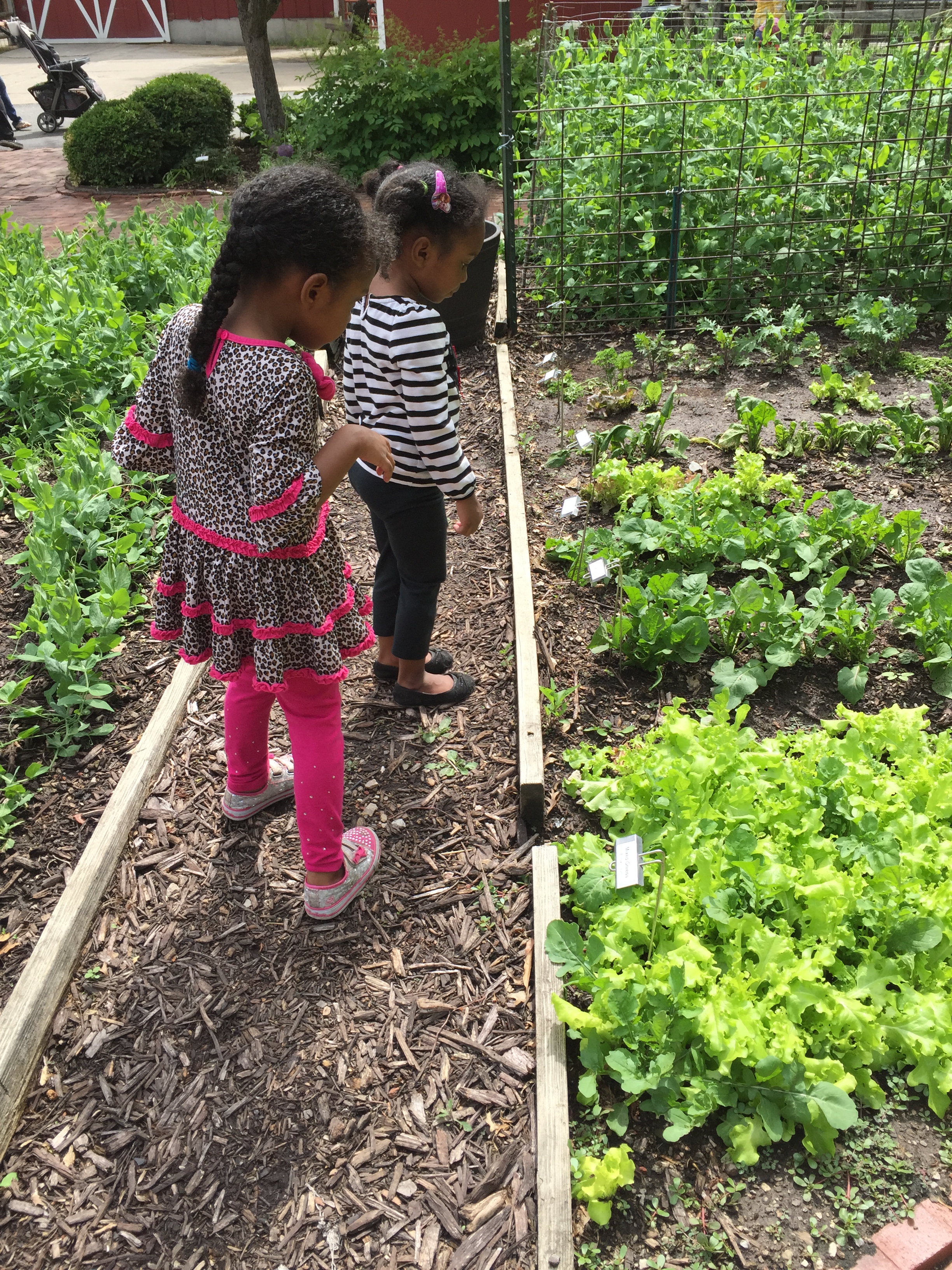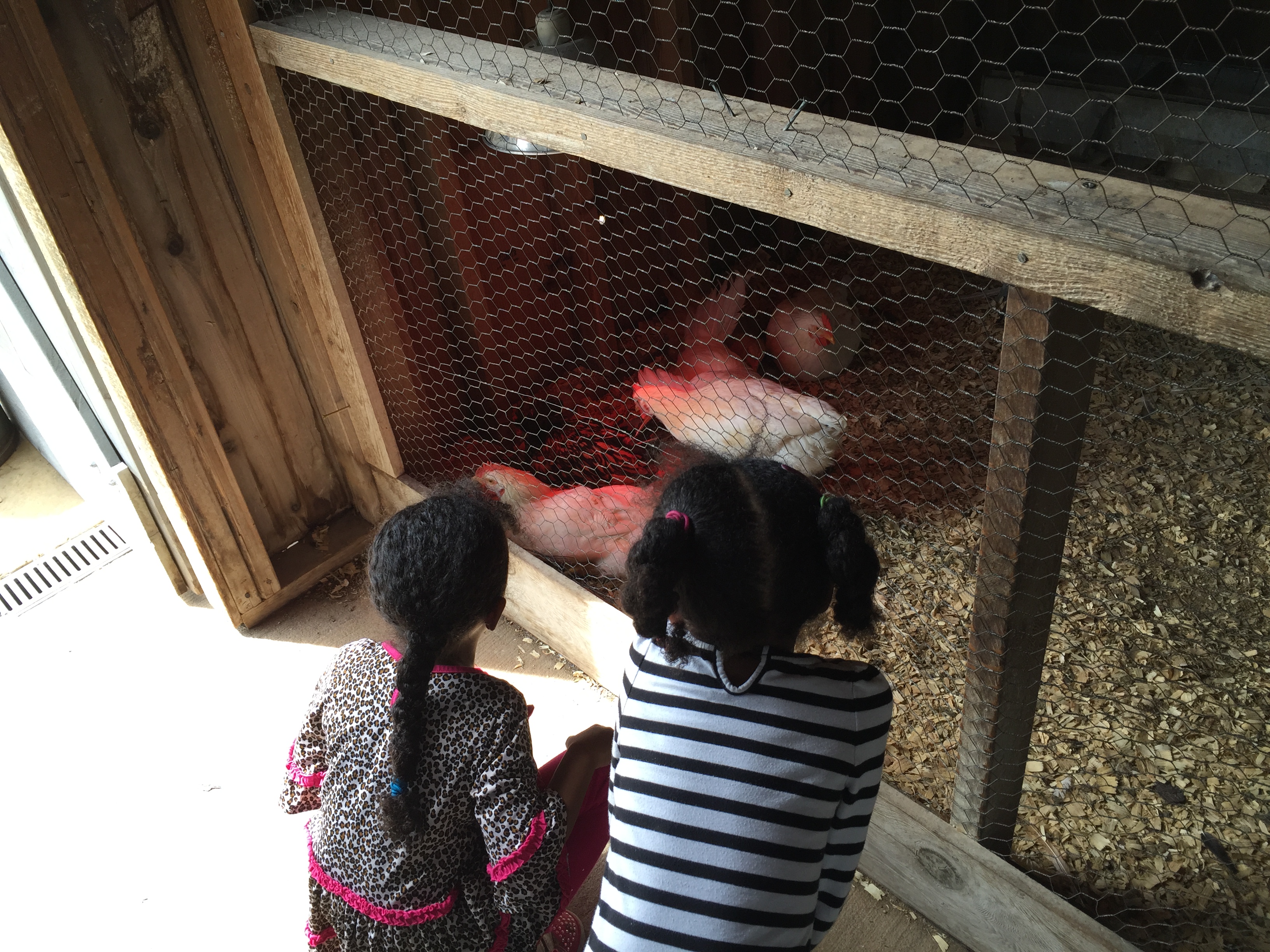 Once we left the Koi pond the girls fed the chickens and pet a sheep. Then played at the playground and explored a log cabin. This was a great way to end Growing Garden.