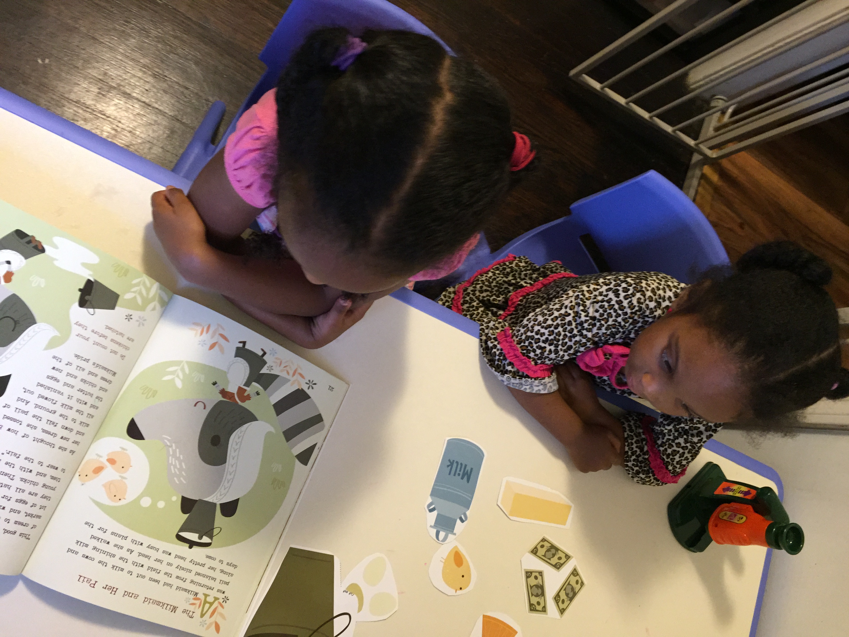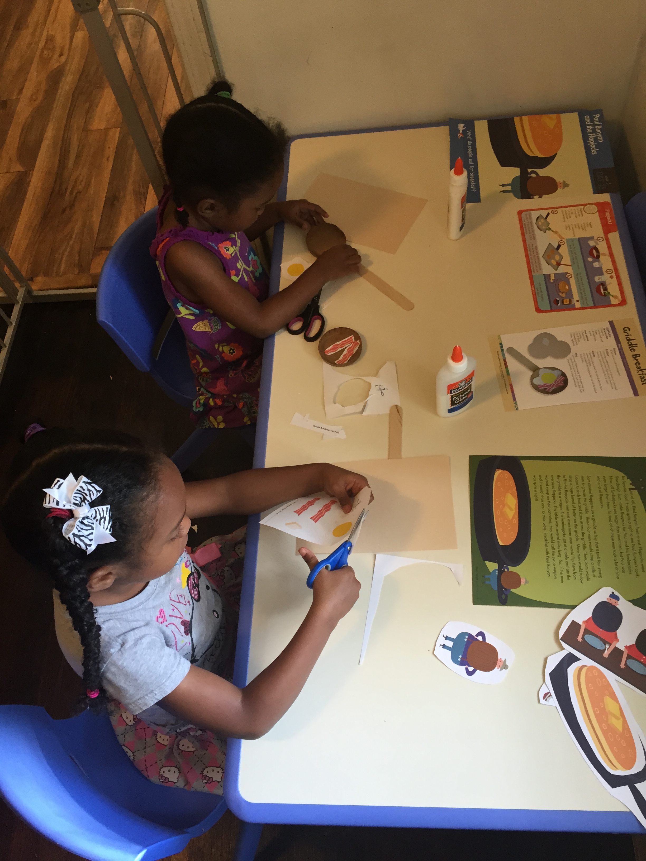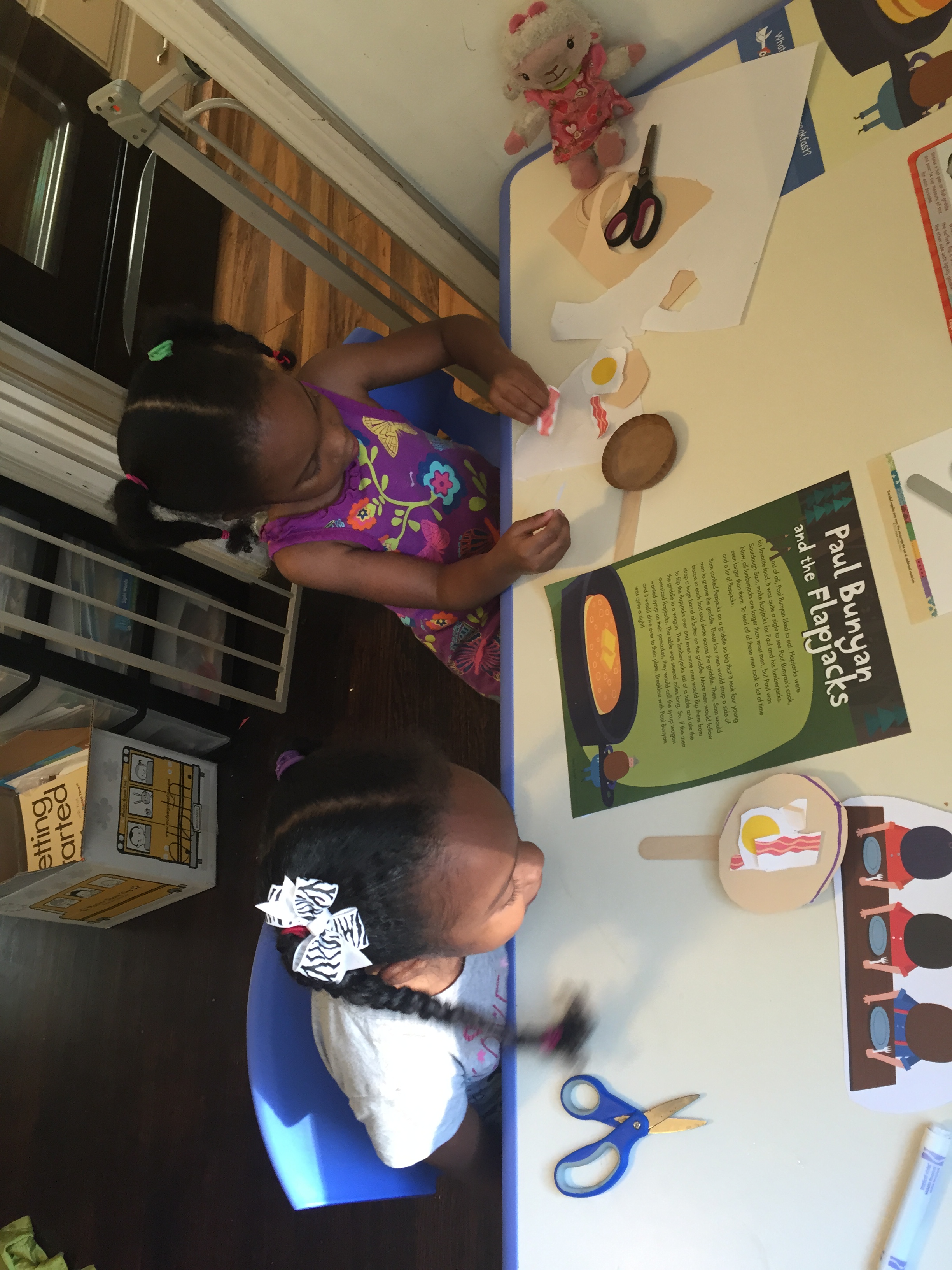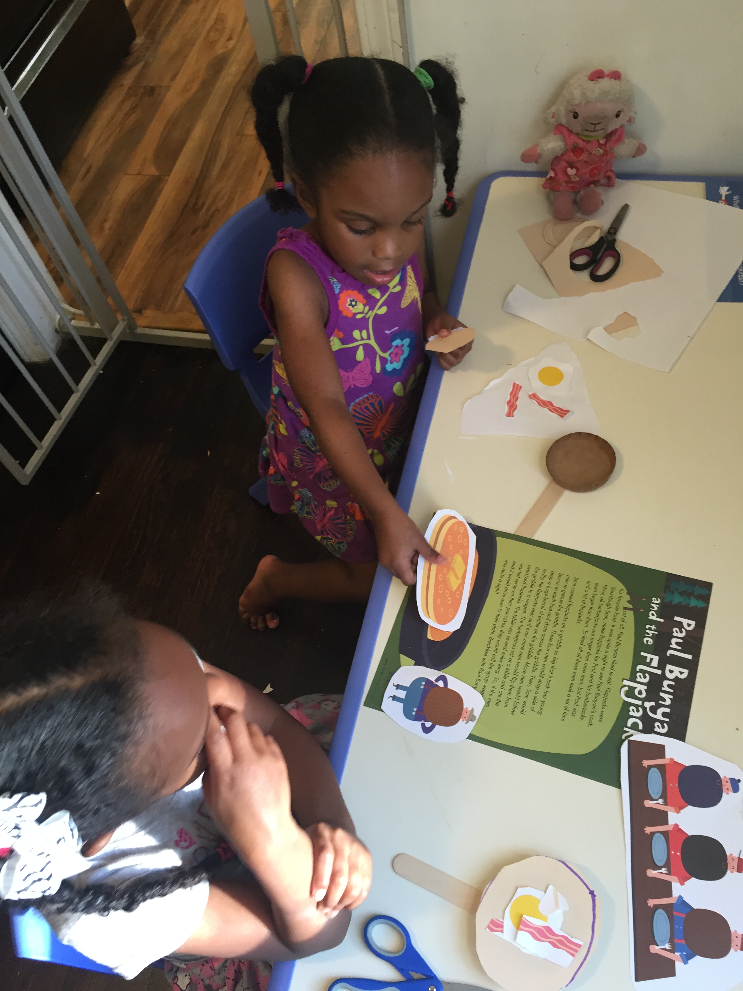 Wednesday story was “Paul Bunyan and the Flapjacks” and the girls loved this story because they love pancakes. We talked about how their dad and I prepare their food for them. I read the story and as I introduce a story item they would pull it to the side.