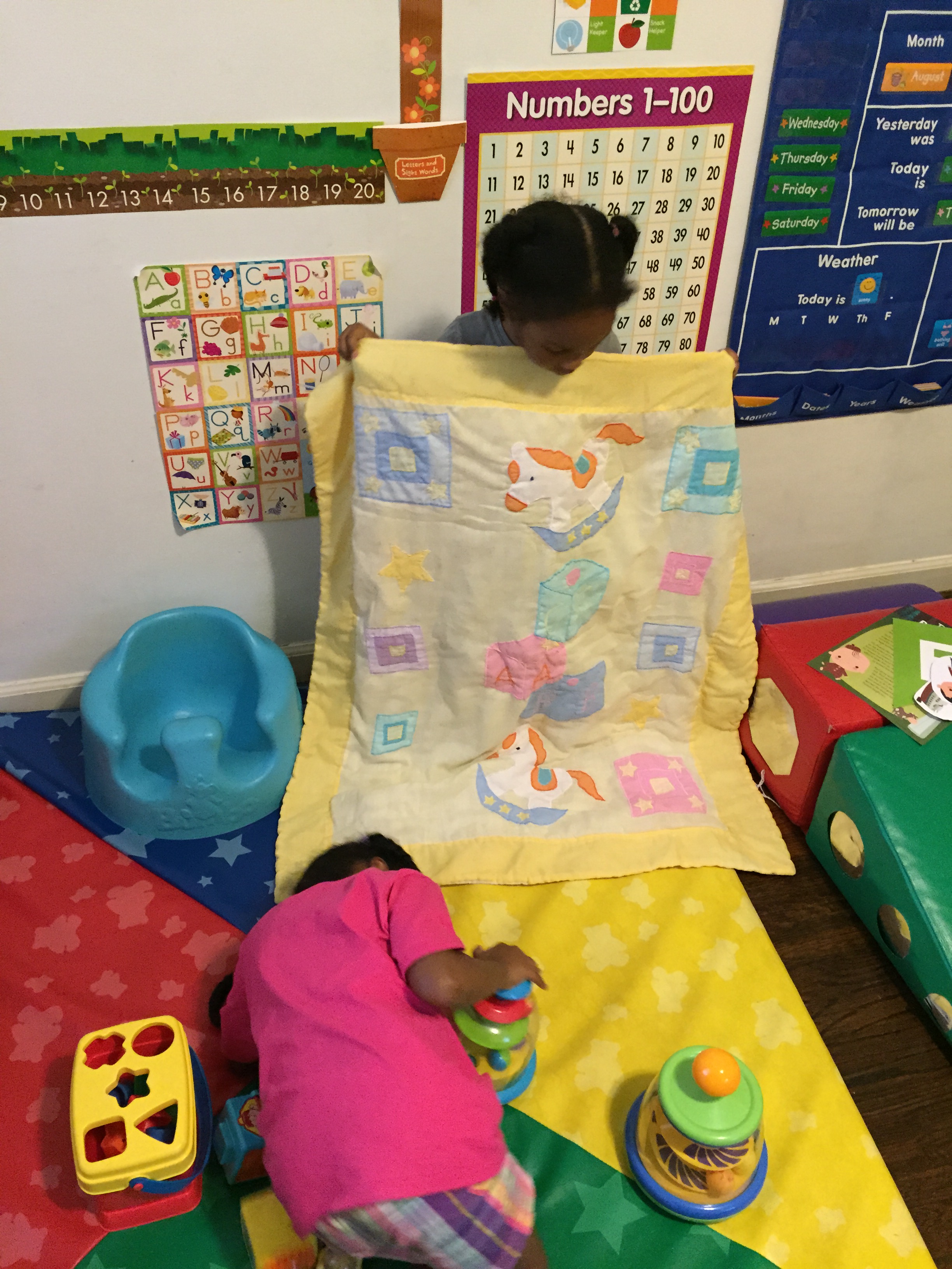 Hi everyone, Monday with Mother Goose Time the girls learned about “The Birth of Paul Bunyan.” we talked about how I took care of them when they were babies. Then I set out baby toys for them to explore. After the girls explored the toys, I read “The Birth of Paul Bunyan” story and as I read the story they would get the item from the story.