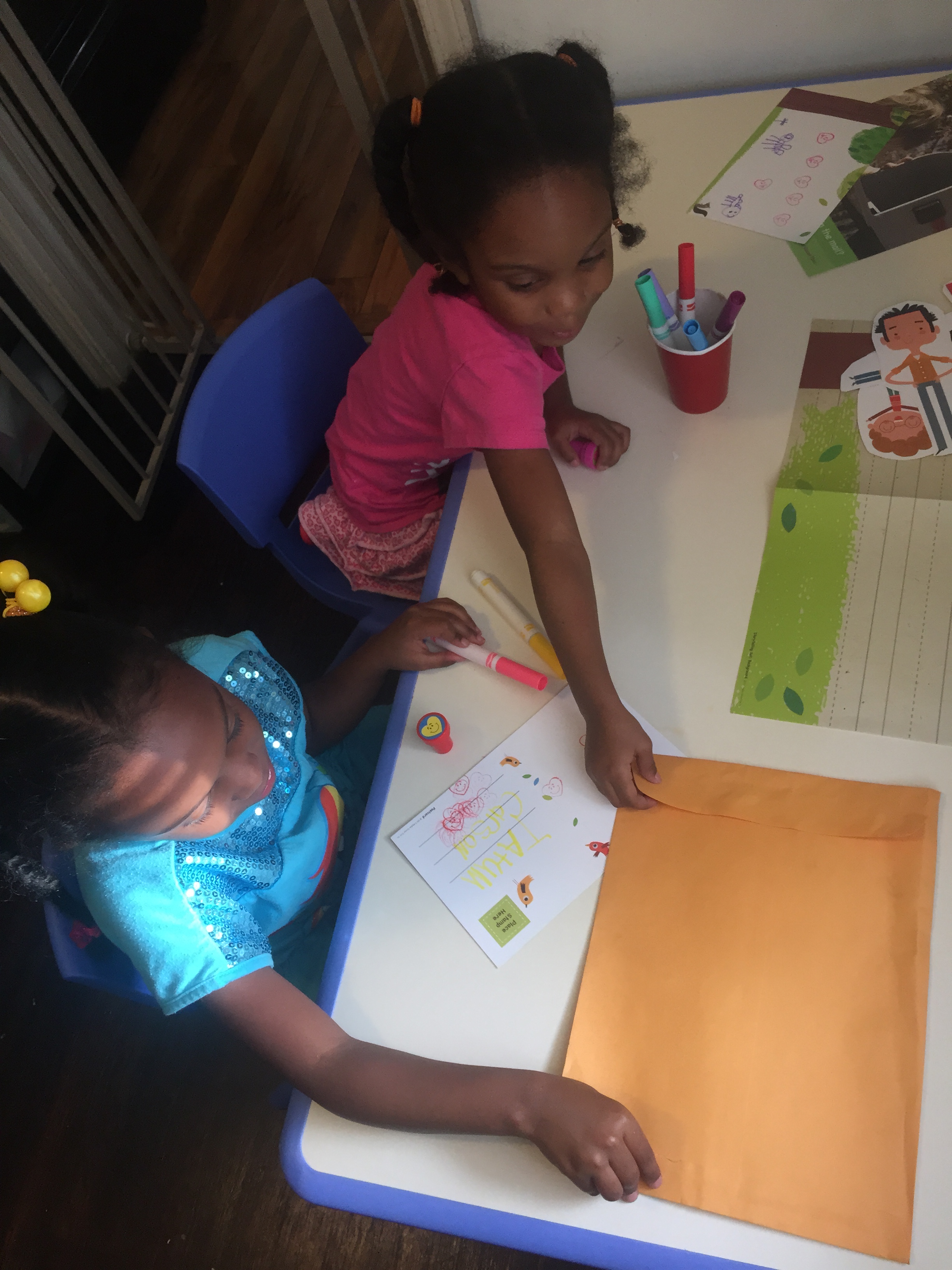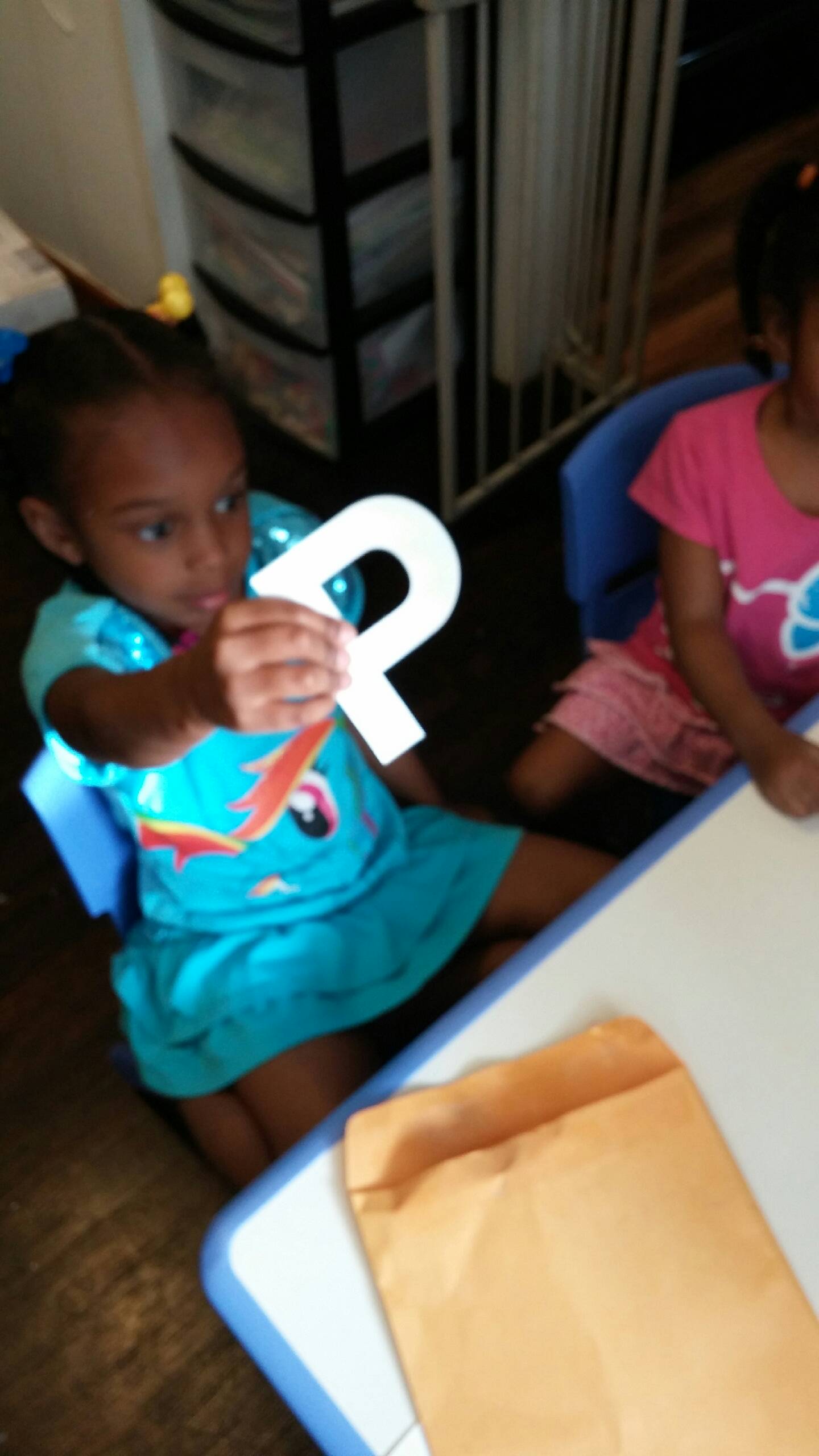 Then the girls did “Mystery Envelope.” I hide two letters in the envelope and had the girls guess what letters and inside while giving them clues.