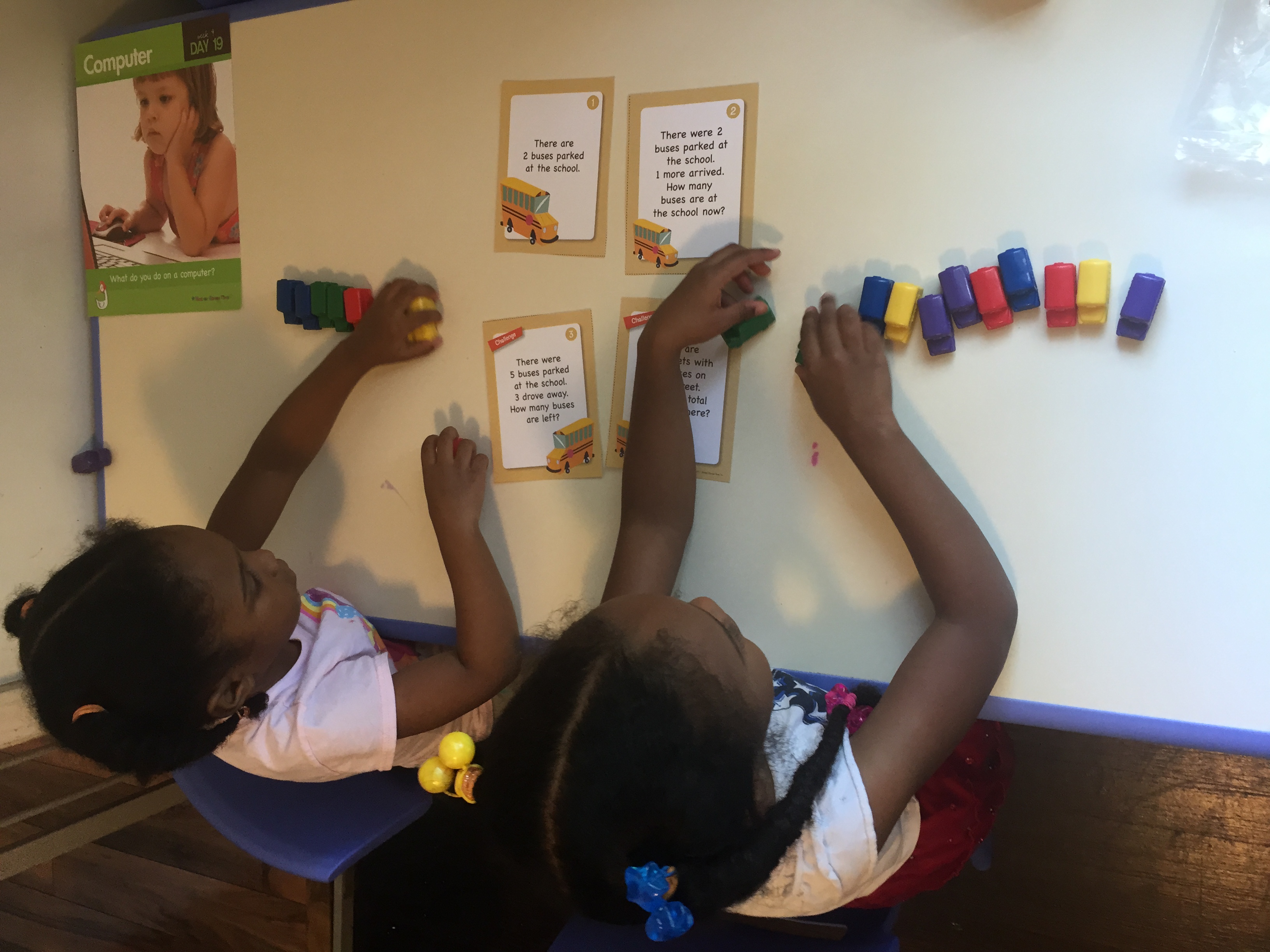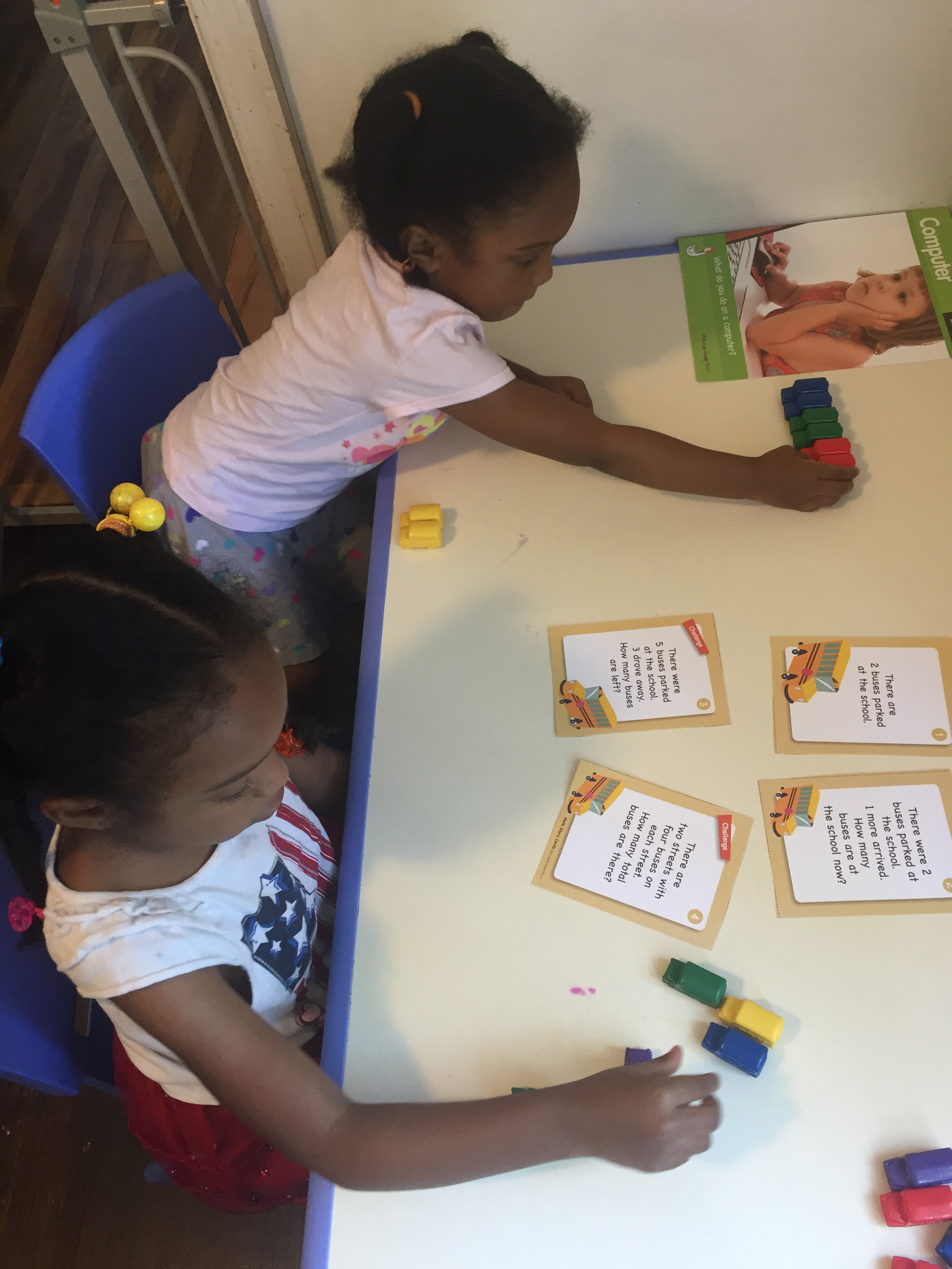 After awhile the girls did “Email Math” with the bus counters. Â They added and subtracted the buses as I read the math story.
