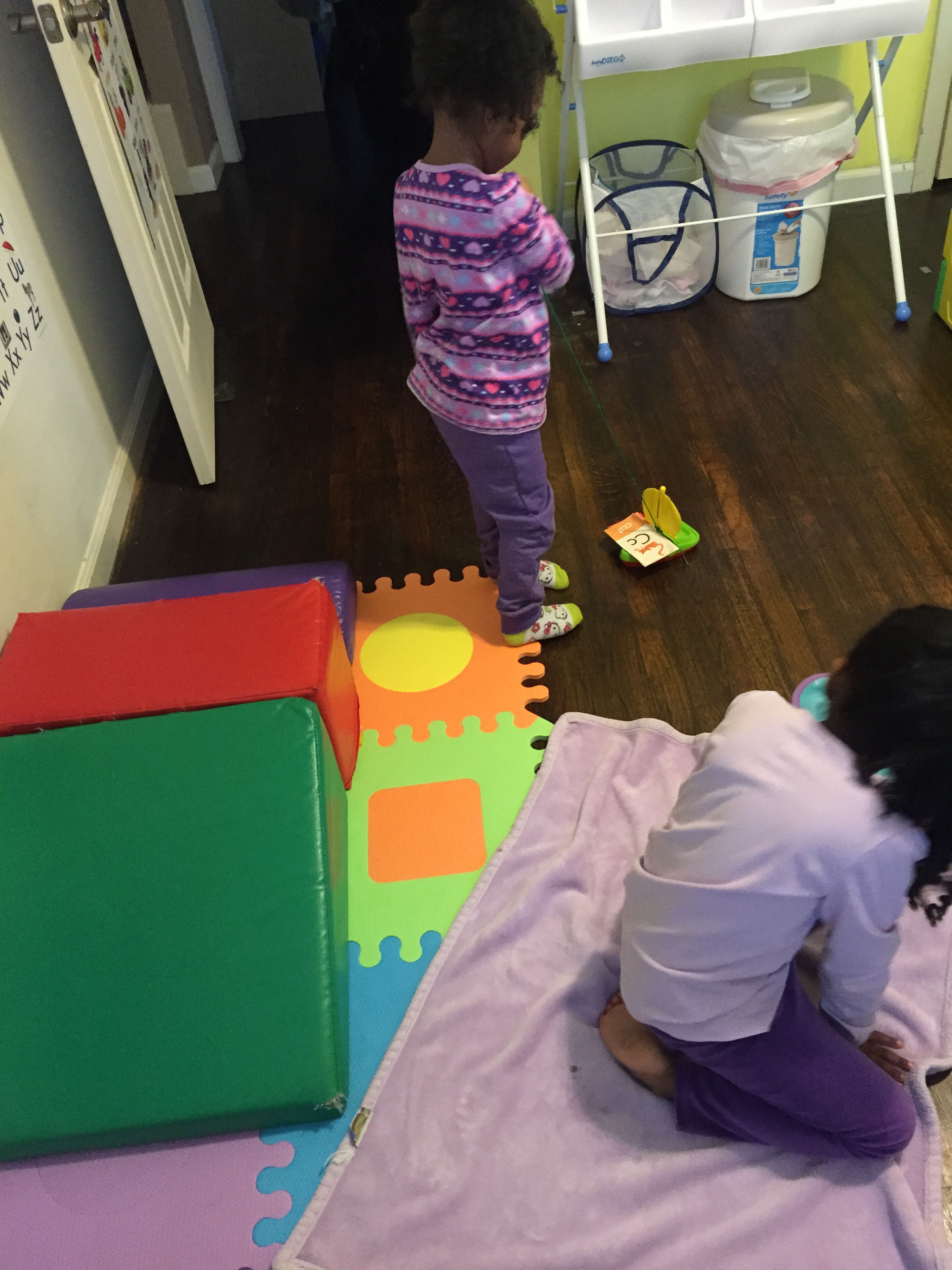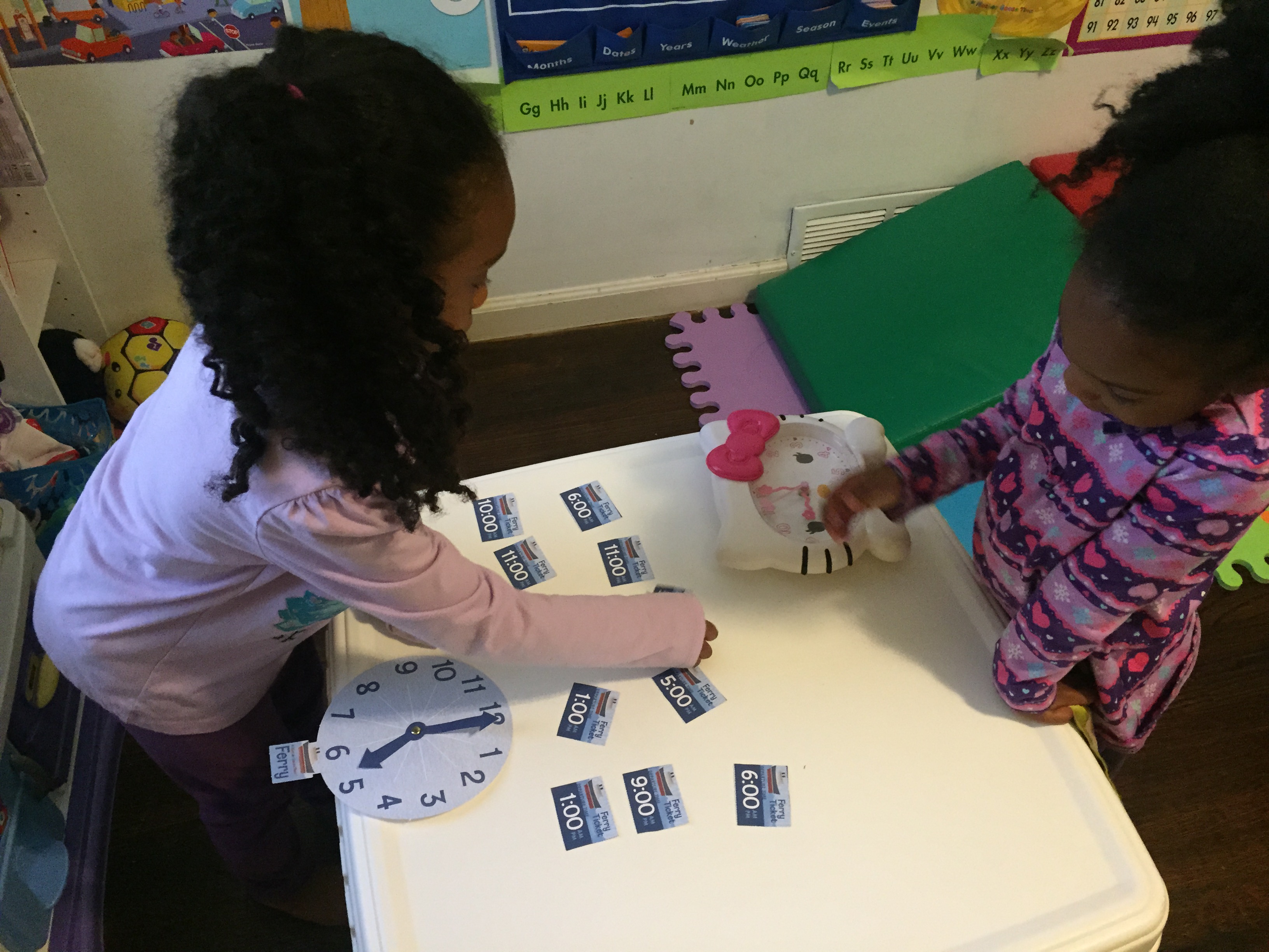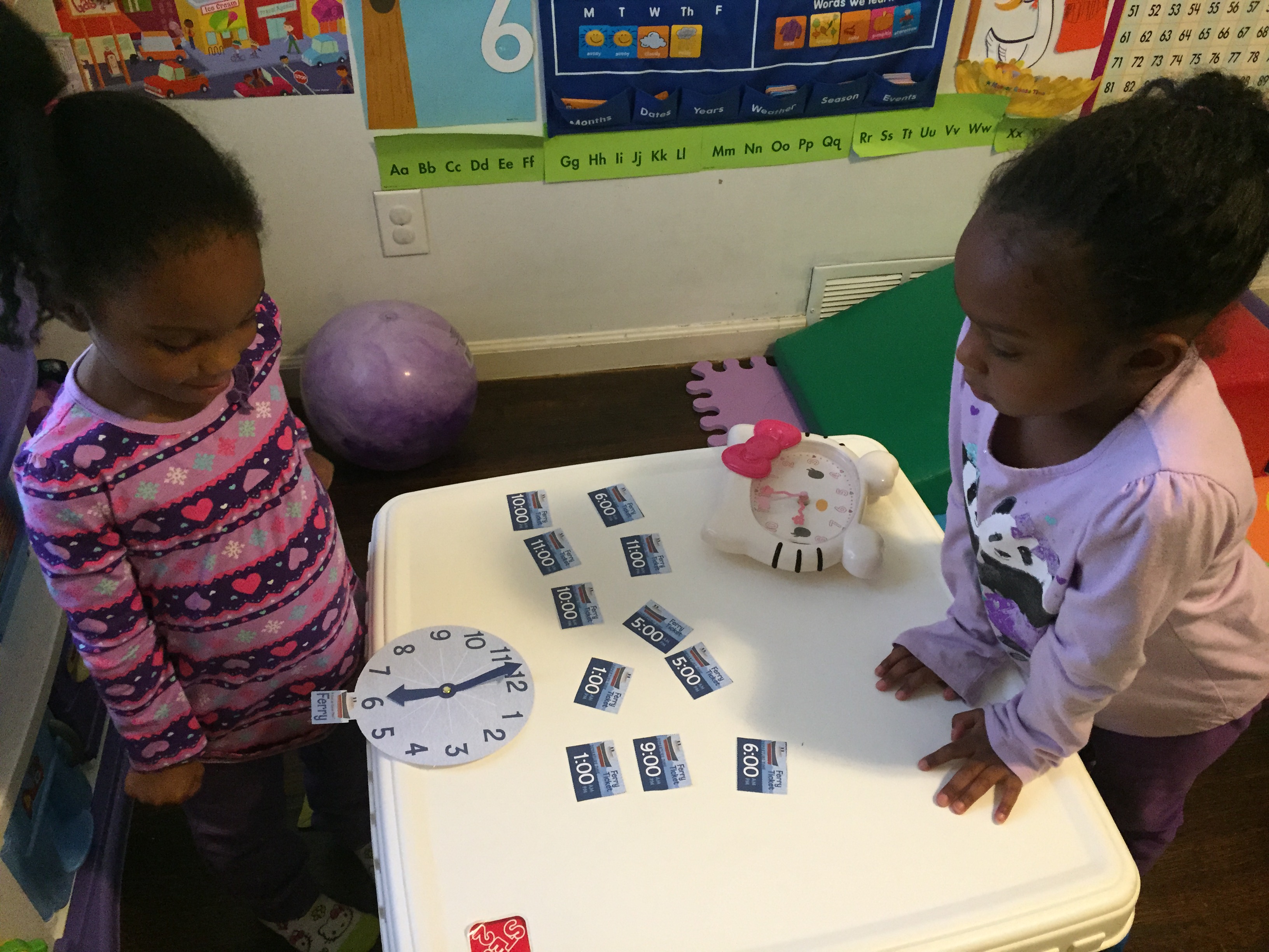 Then they did a activity called “Ferry Schedule.” They would pick a time and give each other tickets to catch the ferry. The girls used blankets as Ferries. They also explored time with their own clock.
