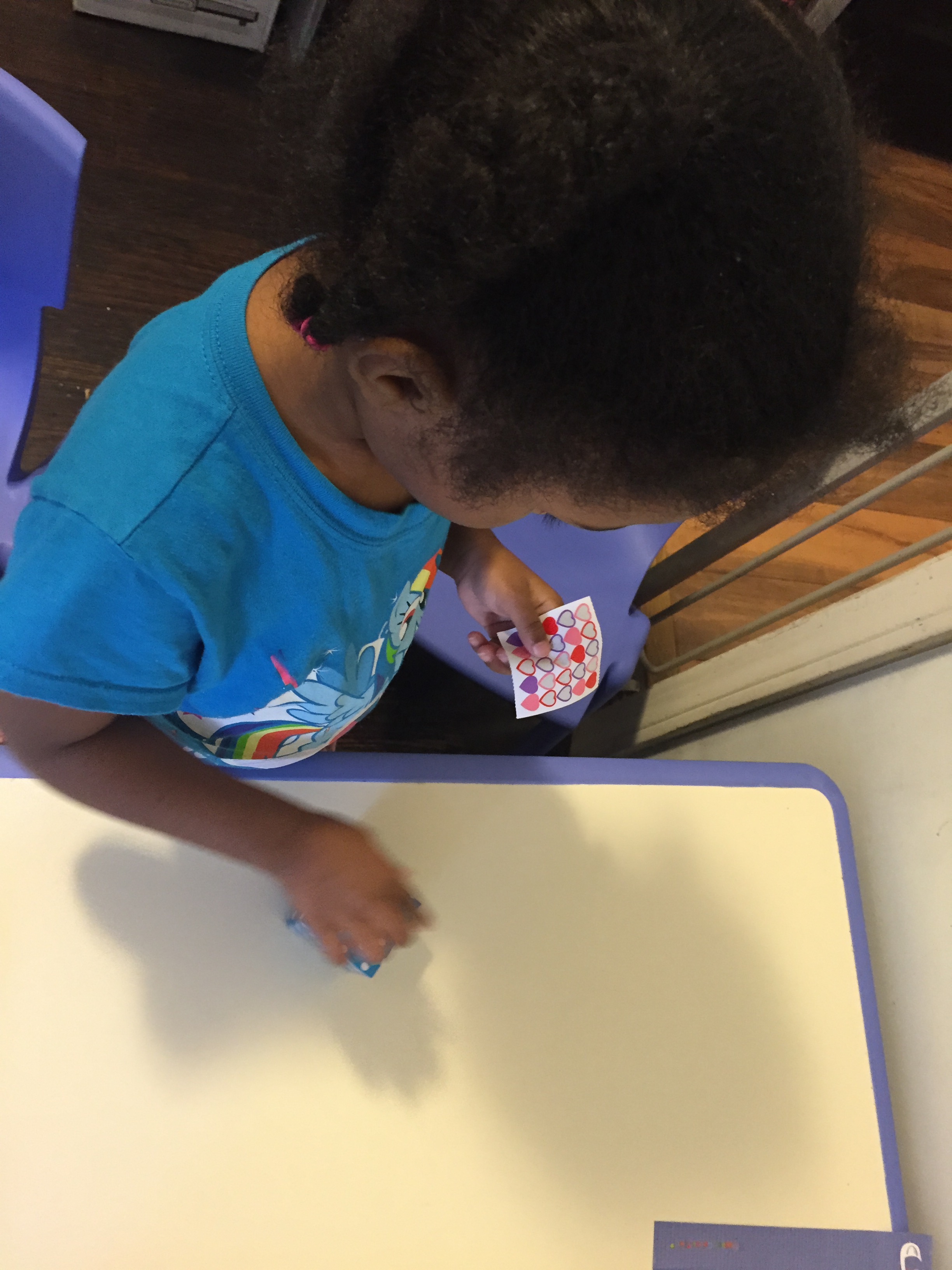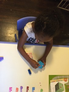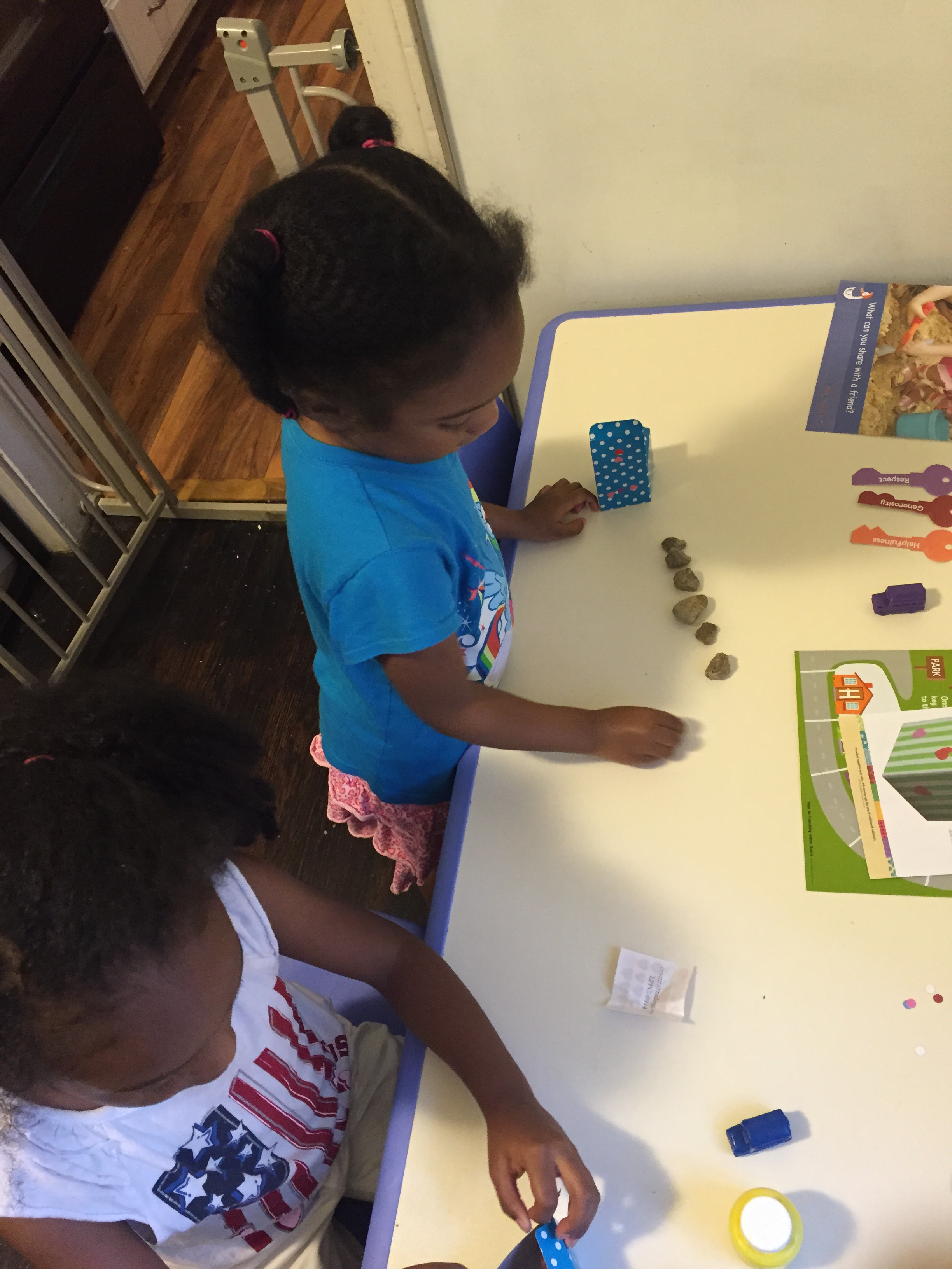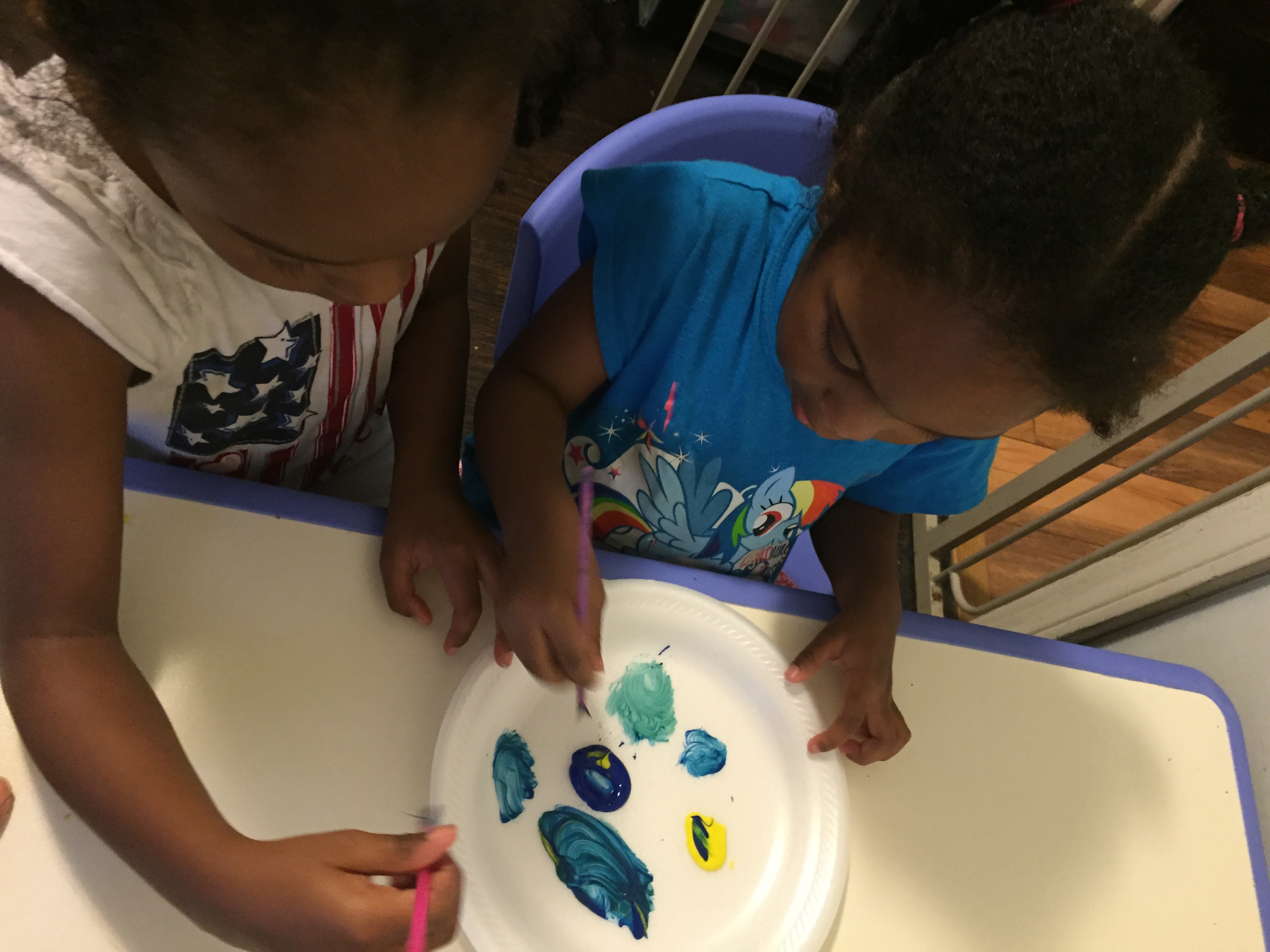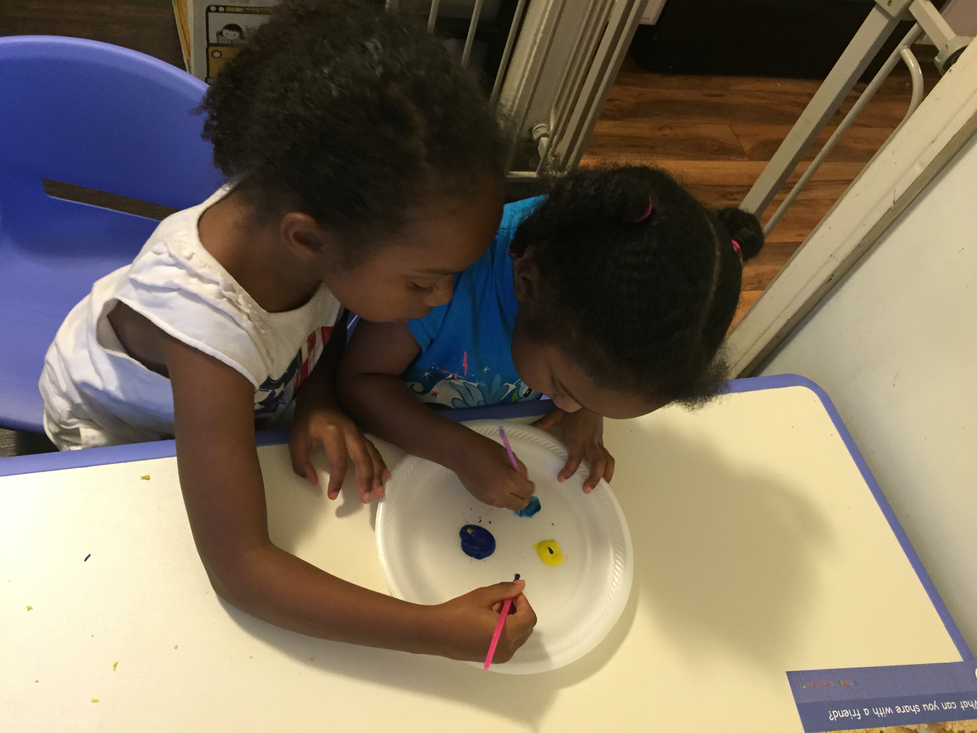 Then “Sharing Makes More,” the girls mixed yellow and blue and watched the color change and compared the different shades of green they made.